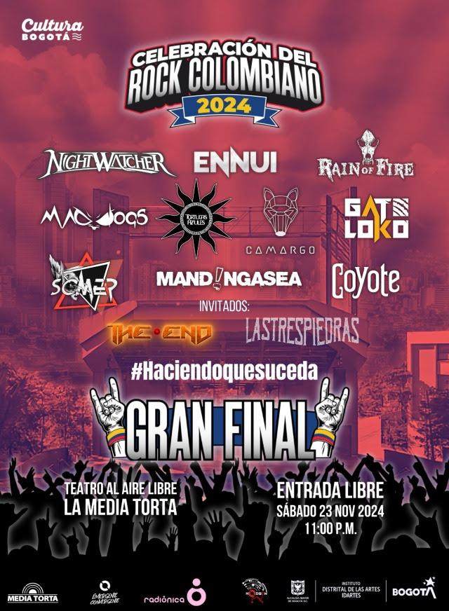 La gran final se llevará a cabo el sábado 23 de noviembre en la icónica Media Torta de Bogotá a partir de las 11:00 a.m. Las 10 agrupaciones finalistas compartirán escenario junto a 2 bandas invitadas de otras regiones, en un evento de entrada gratuita.