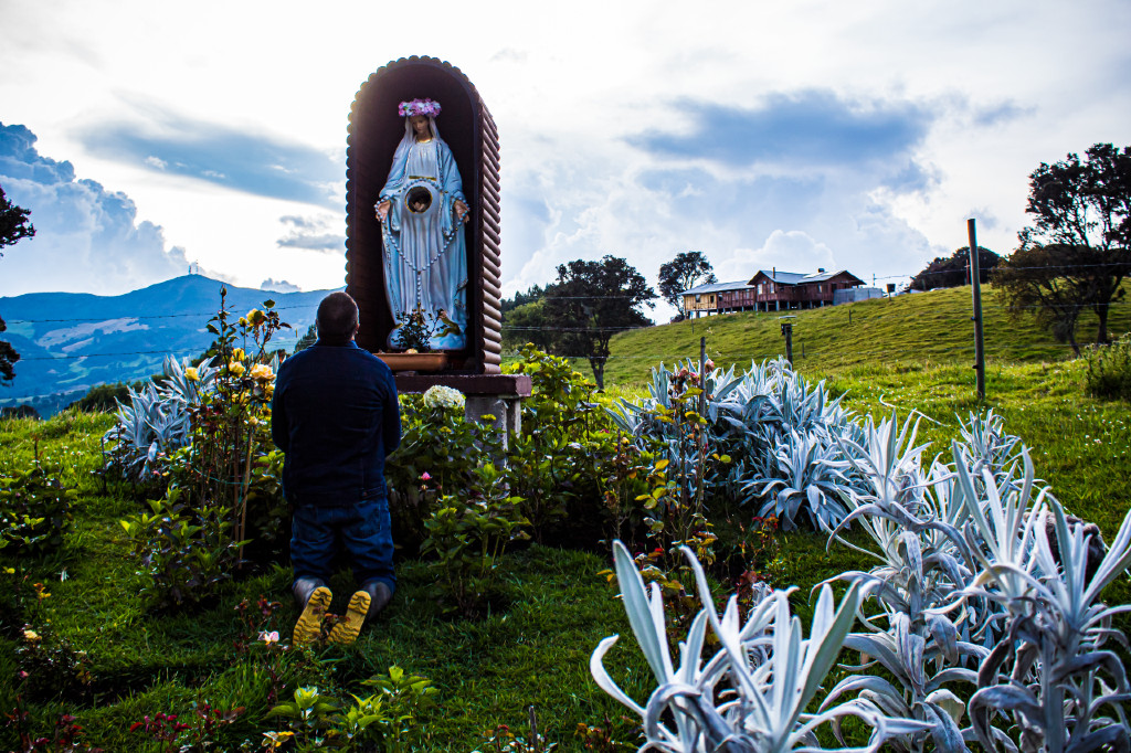 De rodillas, frente al altar de la Virgen despide una extensa jornada de caminatas, conversaciones y anécdotas que dan forma a un relato que se extiende más allá de una comprensión científica. Un diálogo íntimo, fruto de la devoción que nació con él, que lo vio crecer y que aún permanece intacta acompañándolo en todo momento. Permanece en esta posición alrededor de 10 minutos. Son más de las seis de la tarde, Bogotá está a tres horas largas de recorrido.
